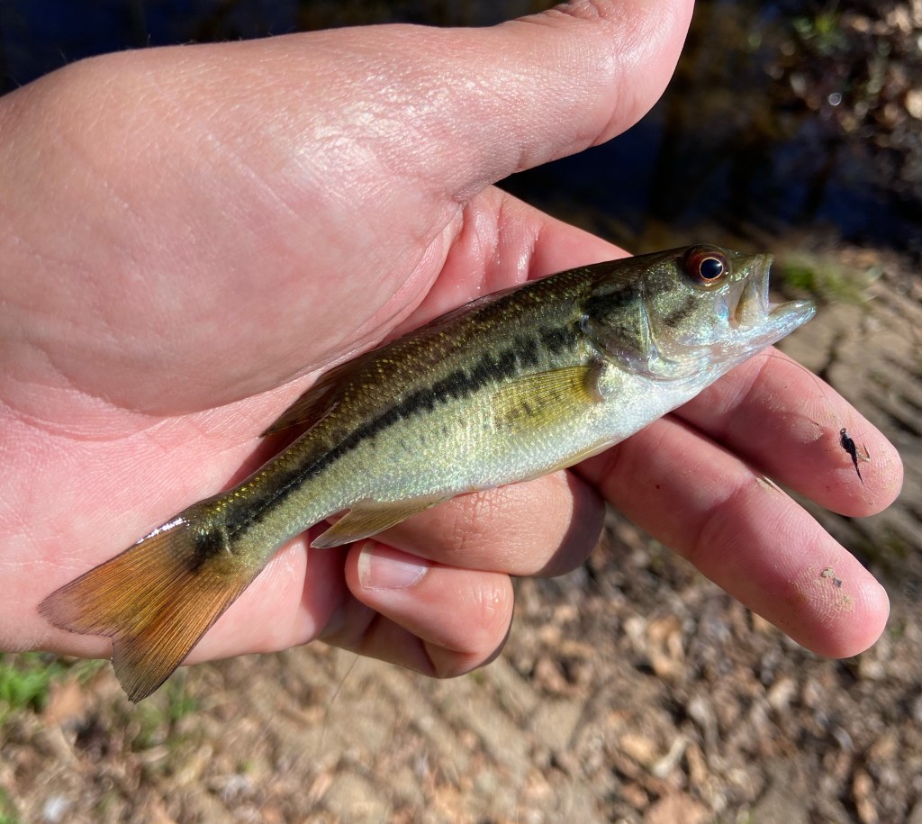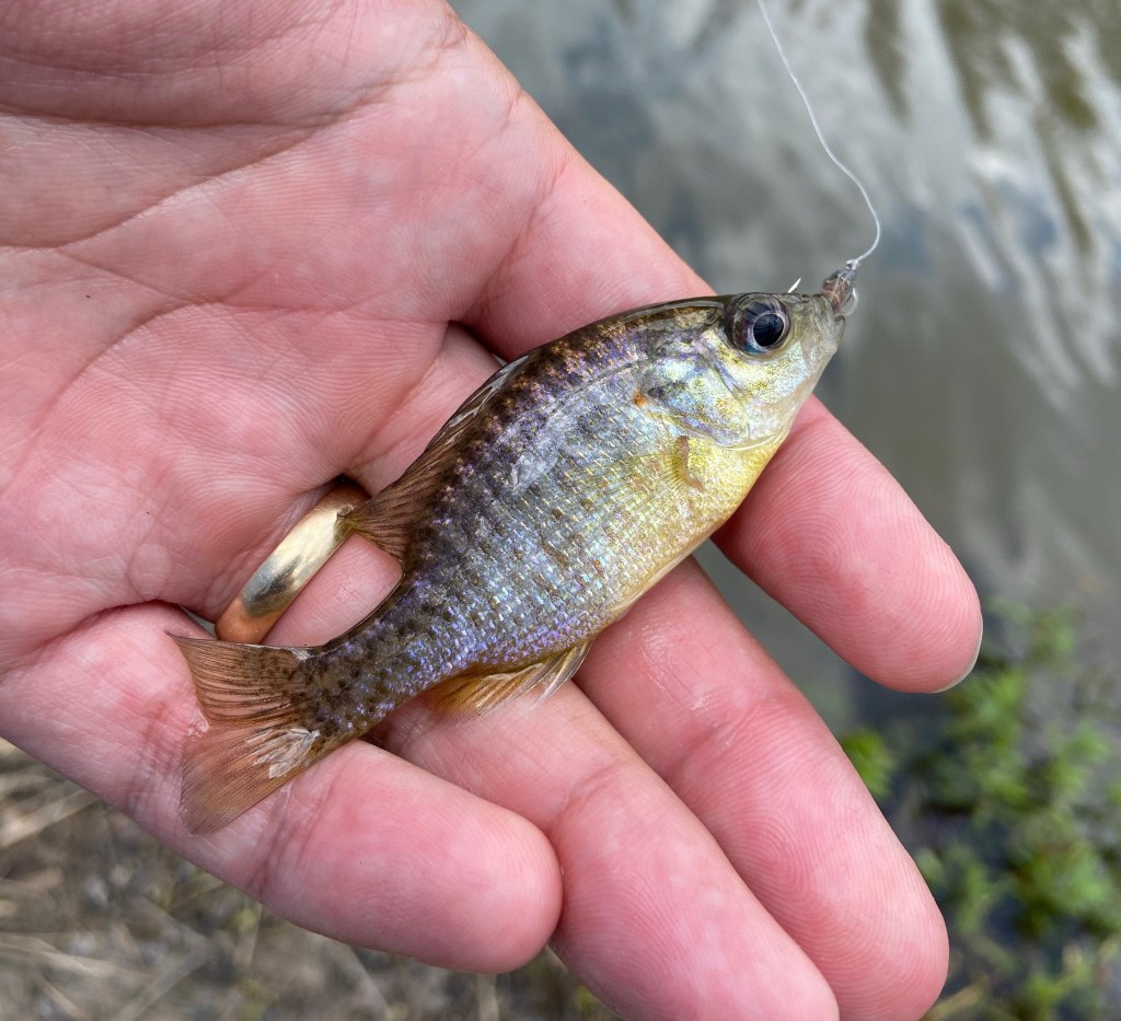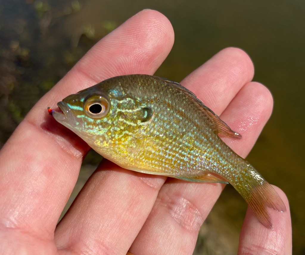 The trick to this type of fishing is being able to detect a strike. With a fly this small, an army of tiny fish will swarm your fly when it hits the water, but most either can’t fit the hook in their mouth, or bite and release before you can feel the strike and attempt to set the hook. I have found that keeping tension on the line by slowly raising the rod tip to retrieve is helpful, but even more helpful is fishing close to the bank and setting the hook when you can see the strike.